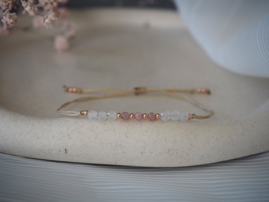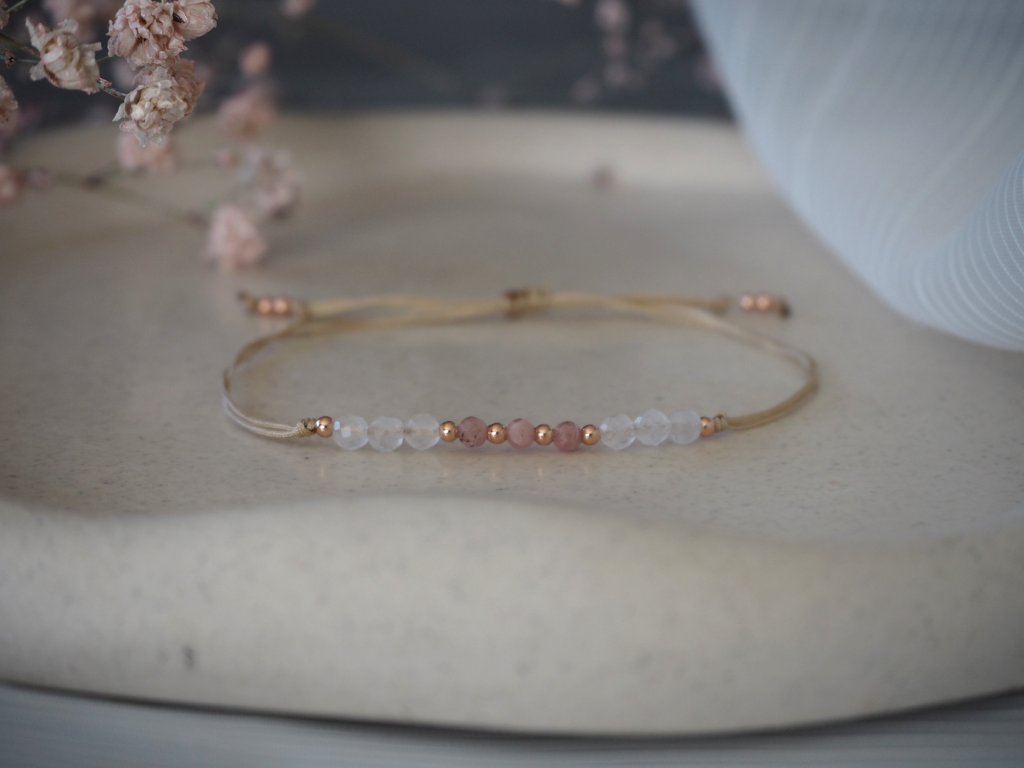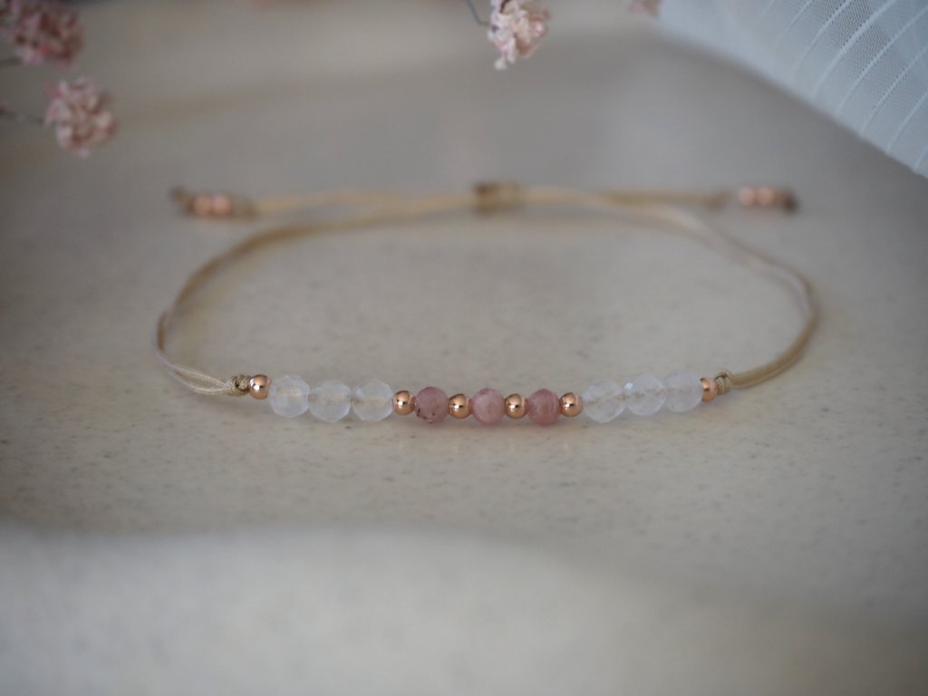 Dámský minimalistický náramek vyrobený z dvojité nylonové šňůrky a broušených korálků bílého jadeitu a rodochrozitu. Náramek je doplněn drobnými rosegold korálky z chirurgické ocele. Jelikož je náramek vyroben z minerálních korálků, může být každý kousek svým zbarvením naprosto jedinečný, a může se proto mírně lišit od úvodní fotografie.