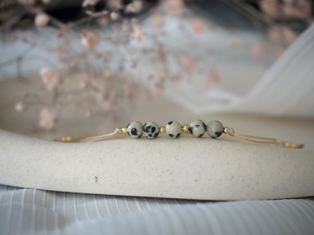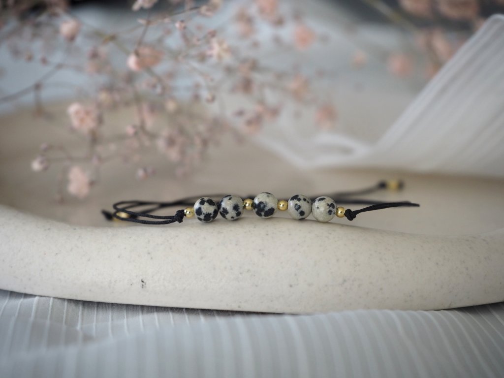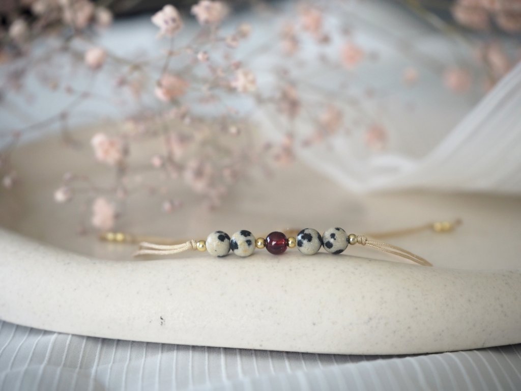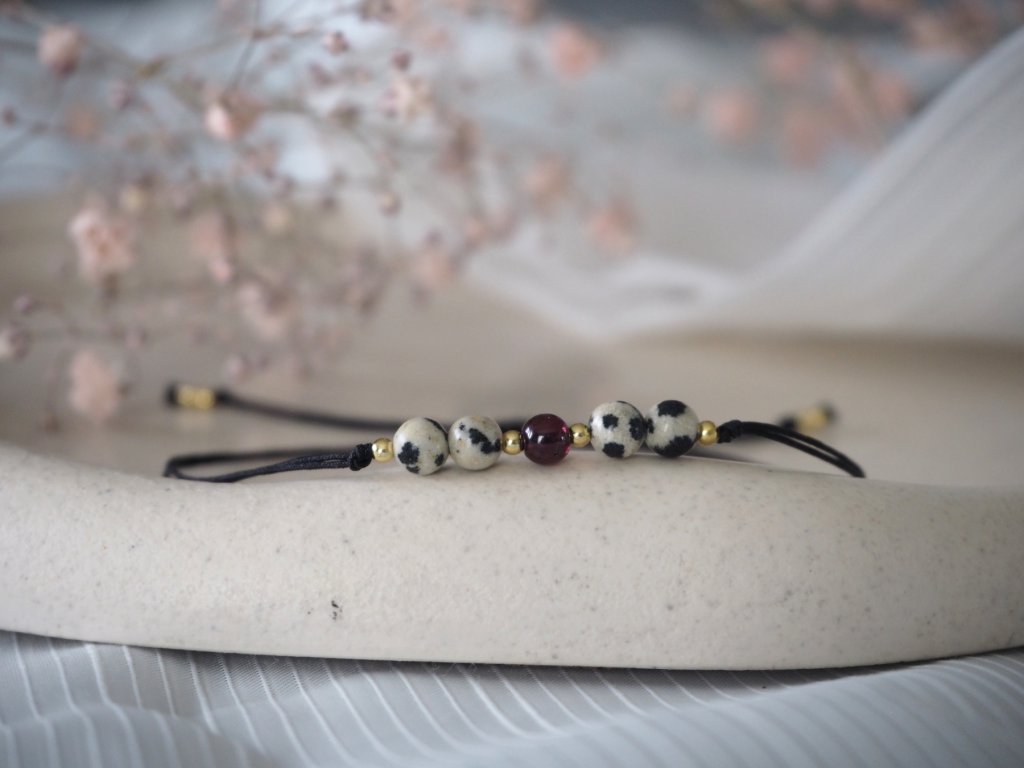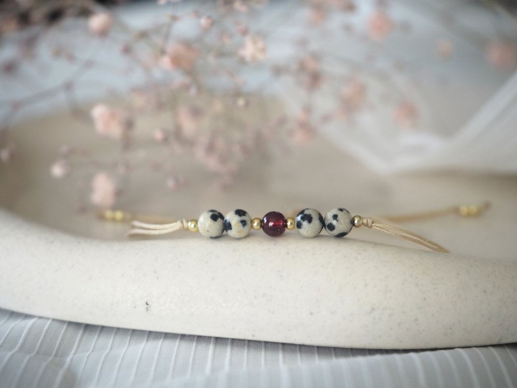 Dámský minimalistický náramek vyrobený z dvojité nylonové šňůrky a broušených korálků jaspis dalmatinu, či jaspis dalmatinu a granátu. Náramek je doplněn drobnými zlatými korálky z chirurgické ocele. Jelikož je náramek vyroben z minerálních korálků, může být každý kousek svým zbarvením naprosto jedinečný, a může se proto mírně lišit od úvodní fotografie.