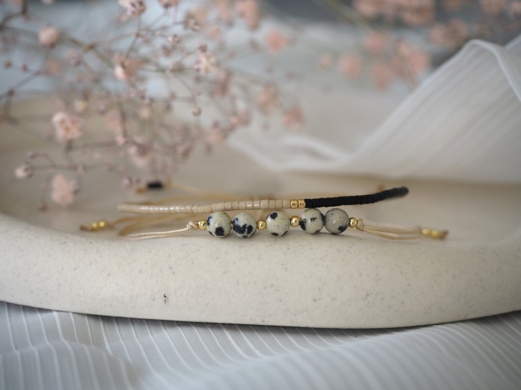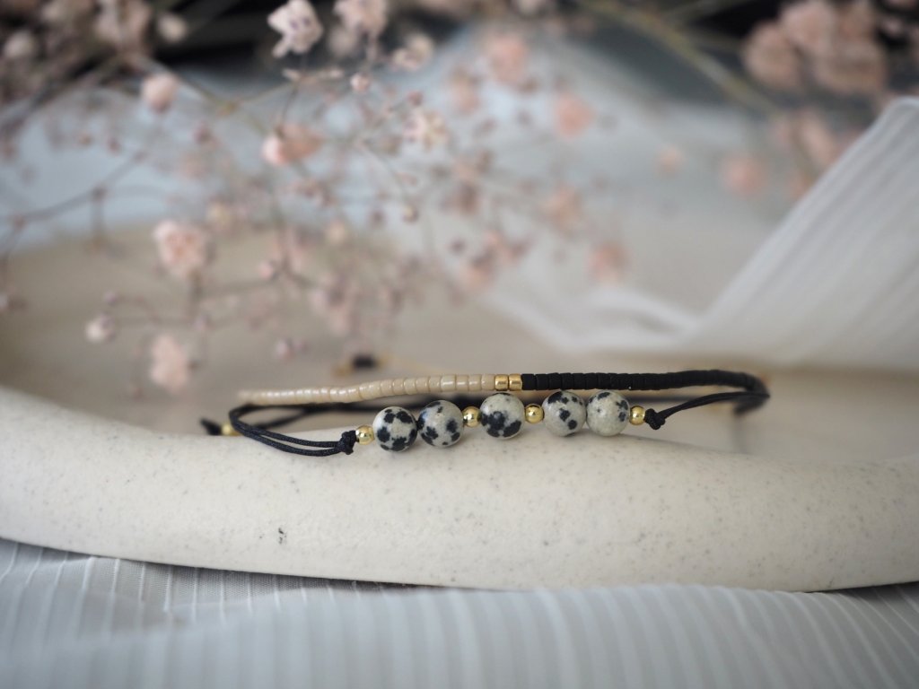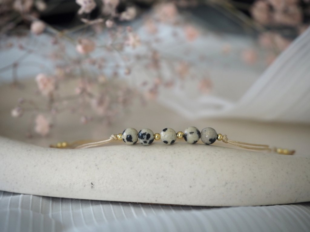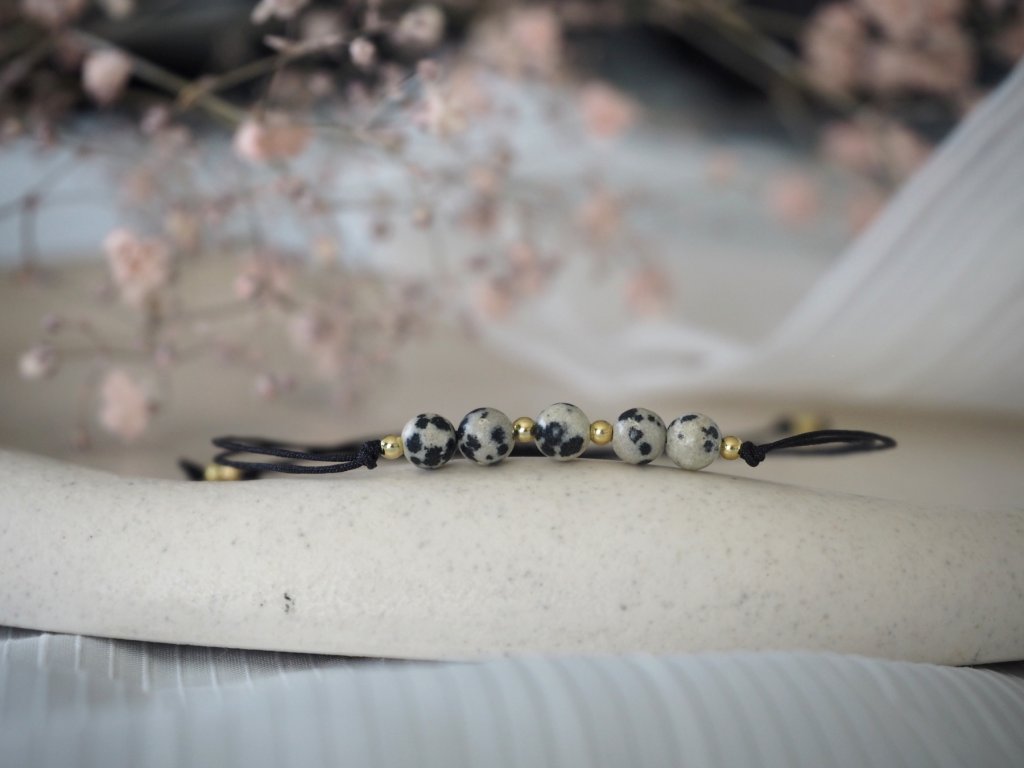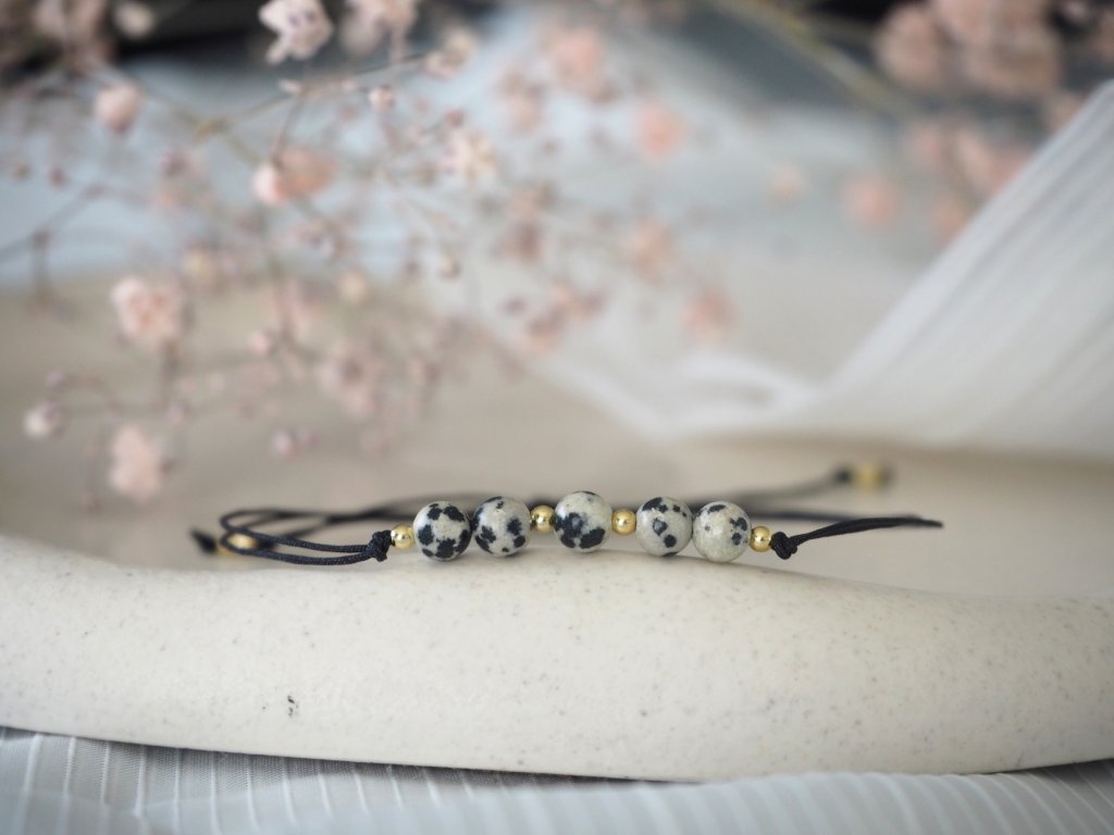 Dámský minimalistický náramek vyrobený z dvojité nylonové šňůrky a broušených korálků jaspis dalmatinu, či jaspis dalmatinu a granátu. Náramek je doplněn drobnými zlatými korálky z chirurgické ocele. Jelikož je náramek vyroben z minerálních korálků, může být každý kousek svým zbarvením naprosto jedinečný, a může se proto mírně lišit od úvodní fotografie.