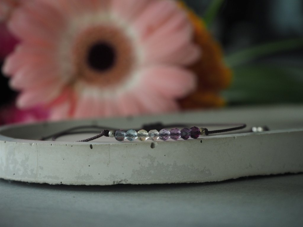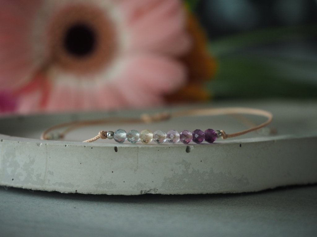 Dámský minimalistický náramek vyrobený ze syntetické šňůrky a broušených korálků fluoritu. Náramek je doplněn drobnými stříbrnými korálky z chirurgické ocele. Jelikož je náramek vyroben z minerálních korálků, je každý kousek zbarvením korálků naprosto jedinečný, a může se proto mírně lišit od úvodní fotografie.